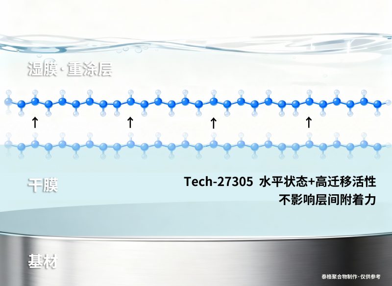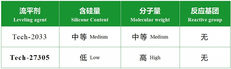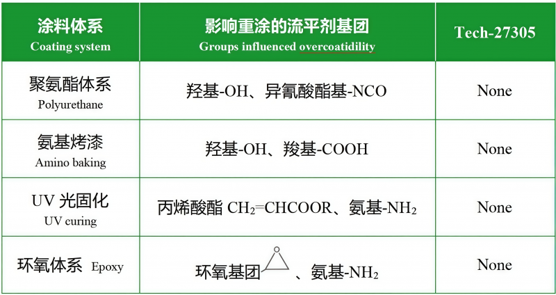 除此之外,Tech-27305流平剂不含可能影响重涂的官能团,避免因端基参与树脂的交联反应而使得体系失去重涂性。