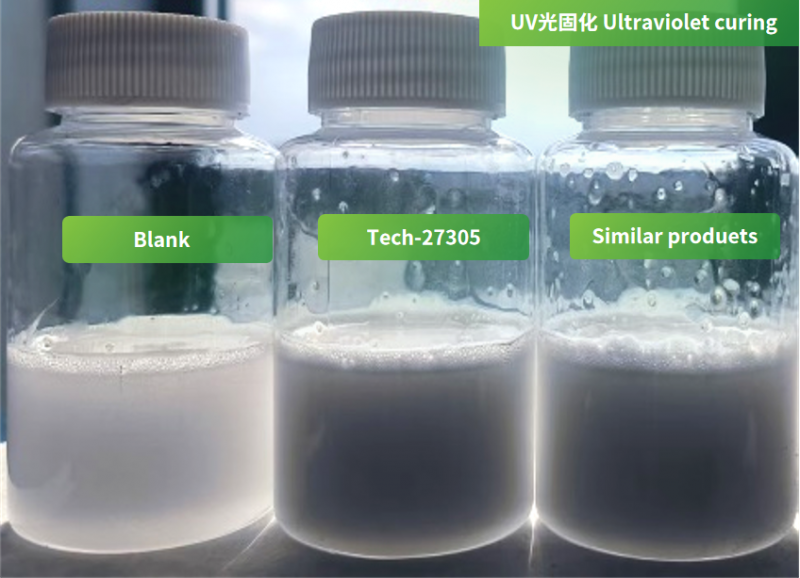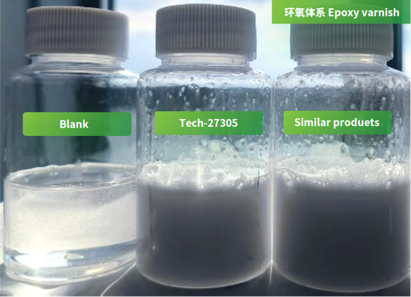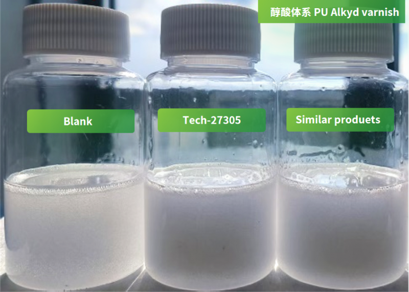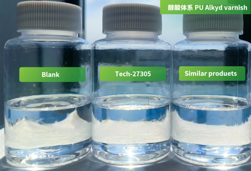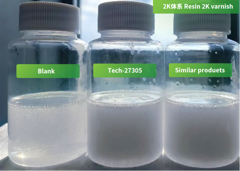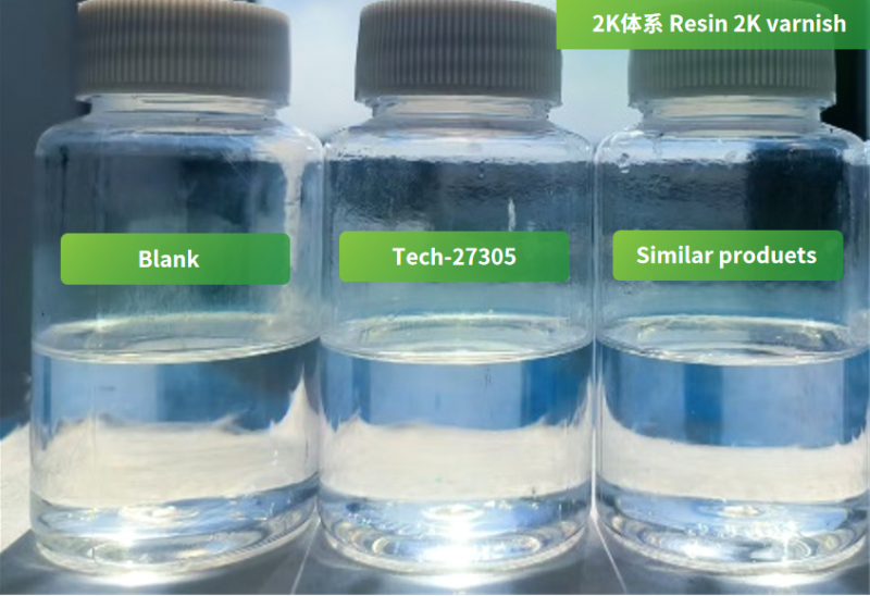 在四大体系(2KPU、UV、环氧、醇酸)中,Tech-27305流平剂的相容性均表现为“与空白样无异”,添加后不影响透明度。