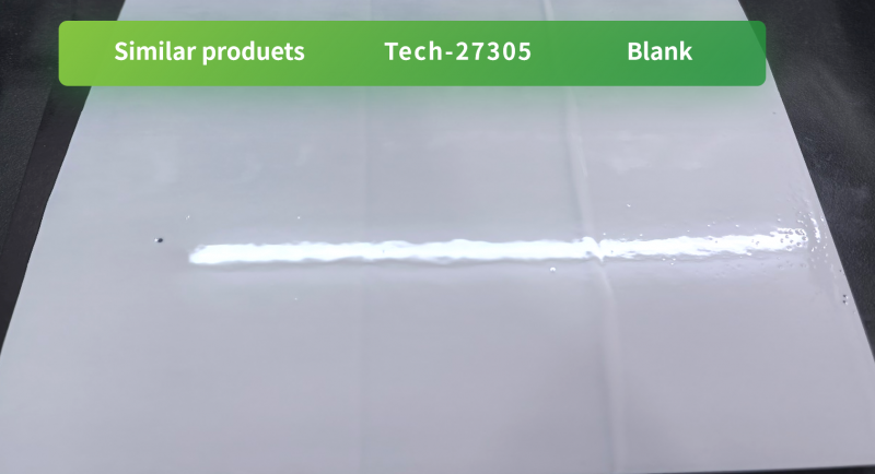 在刮涂测试中,对于比国际产品,Tech-27305表现出优异的防缩孔性,流平性能则两者接近,加入流平剂的体系对比空白对照样流平效果均有显著提升。