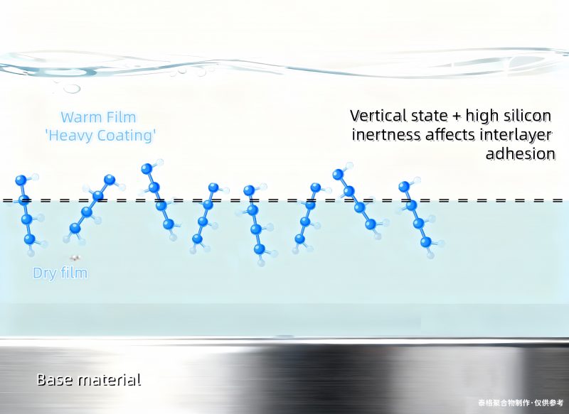由于高硅聚合物存在更多迁移“惰性”,过量添加时易在漆膜表面易形成垂直状态,高硅惰性和垂直状态将影响有机硅流平剂迁移,进而影响层间附着力,而Tech-27305流平剂表面形成的有机硅更“稀疏”,其高分子链段结构更倾向于“躺”在表面而非“直立”,这为有机硅快速迁移至重涂层提供了很好的条件,从而保证了优异的重涂性。