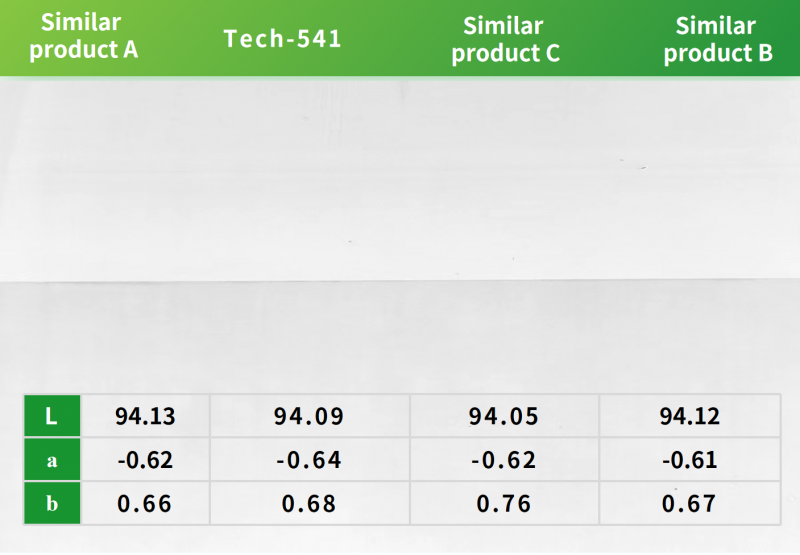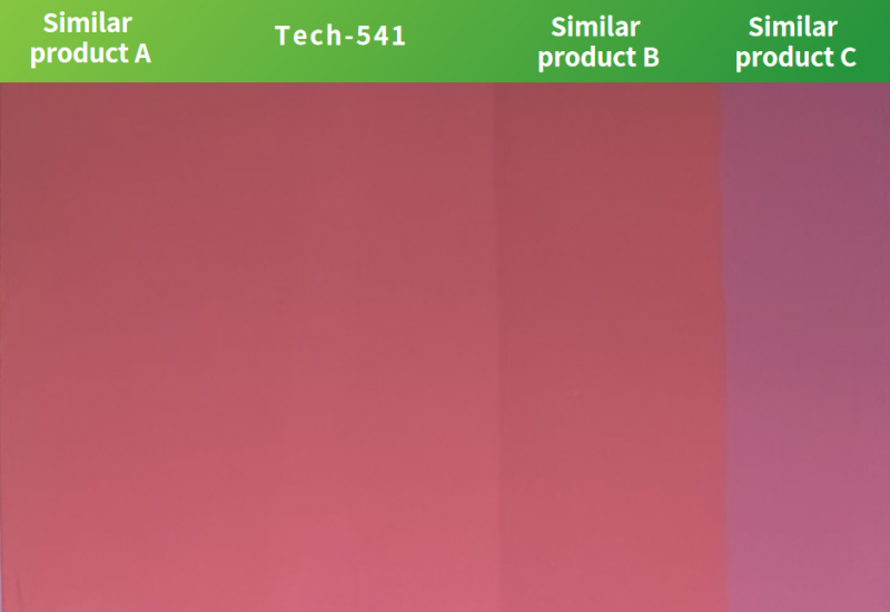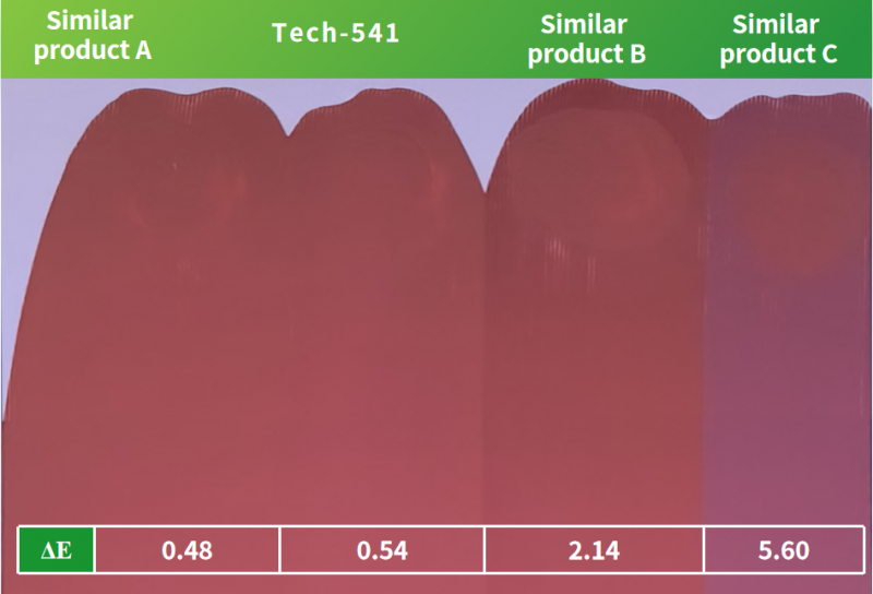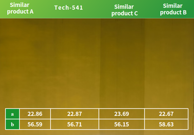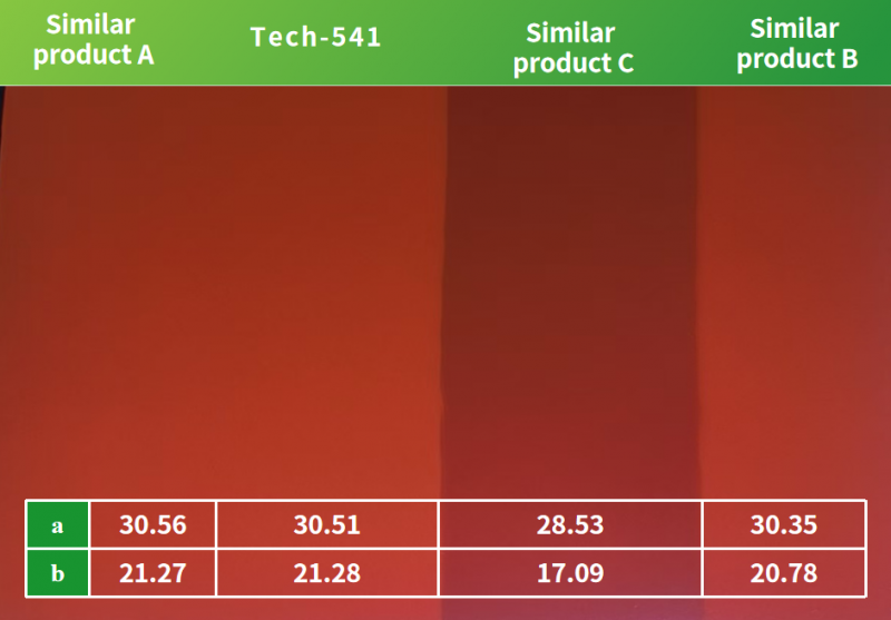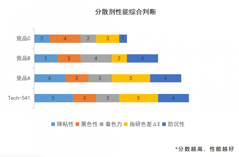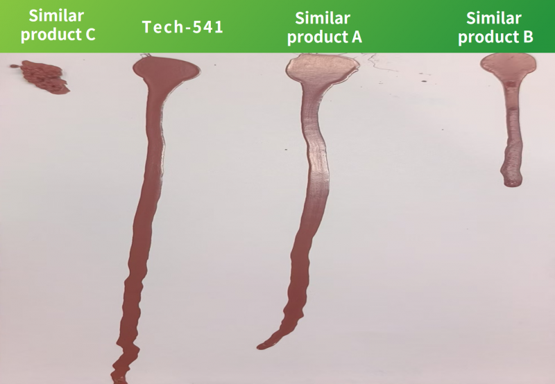 Tech-541是一款综合性能优异的分散剂,其整体表现与国际领先(竞品A)相当,其中在流动性上更具优势,对于钛白粉、氧化铁等无机颜料展现出卓越的流动性能,对浮色与展色的平衡佳。
