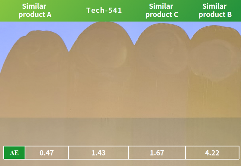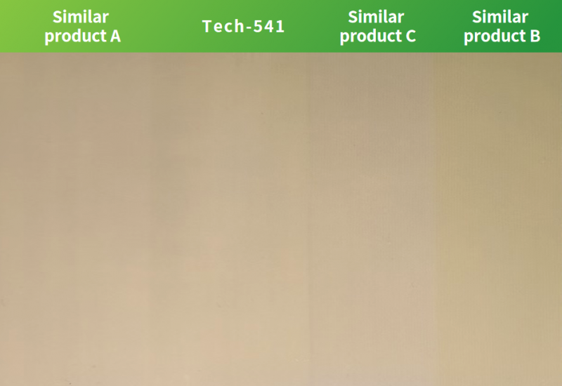 着色力和浮色测试中,Tech-541指研色差小,在两个性能中达到了不错的平衡,这意味着在不同涂层厚度和接缝处颜色也保持一致,低的色差让施工人员更佳放心使用。