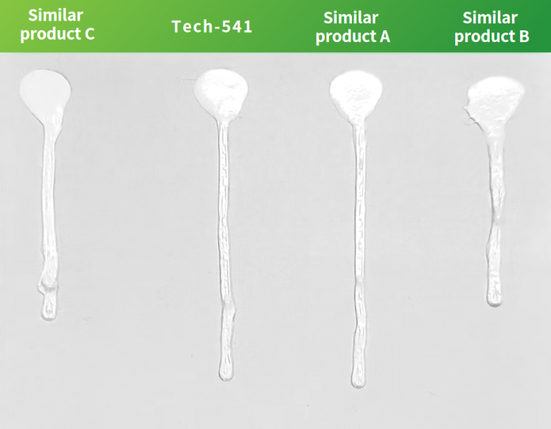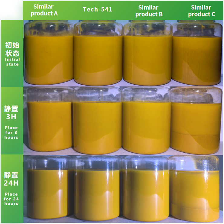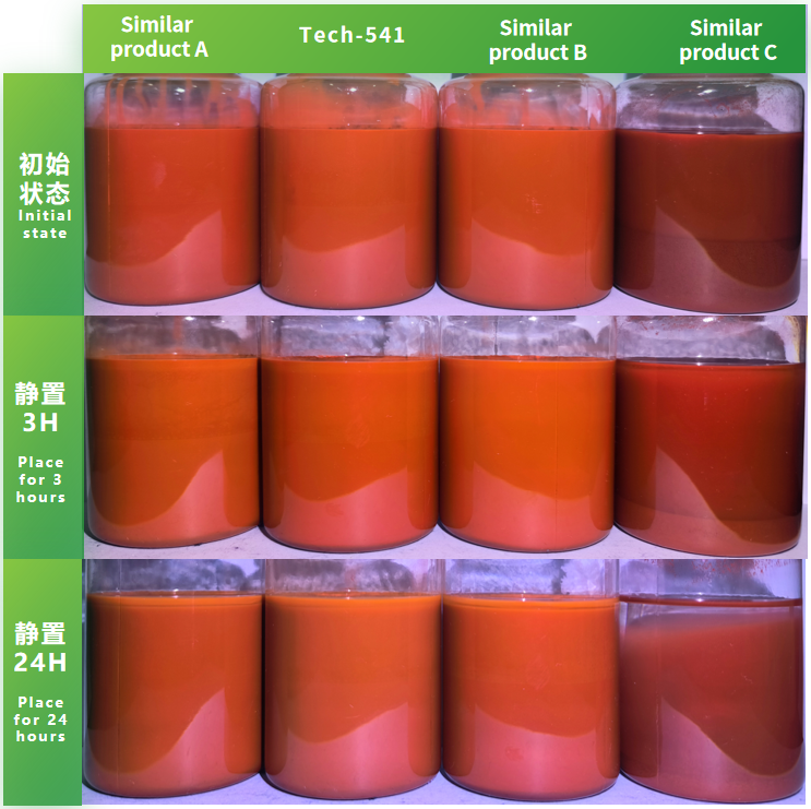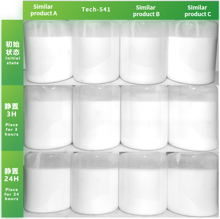 防沉性是保持浆料持续均一性的条件之一,从测试(上图)可以看出,Tech-541防沉性表现优异。在所有测试中,Tech-541仅出现轻微分层,与此不同的是竞品C随静置时间的增加,出现了严重分层。