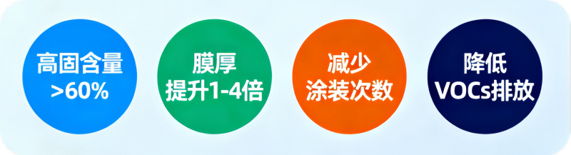 高固体份浆料有着超过60%的体积固含量(参考:一般面漆PVC典型范围为0.25~0.45),单次涂装膜厚相比传统涂料提高1-4倍,有效减少涂装次数和减少VOCs等众多优点。