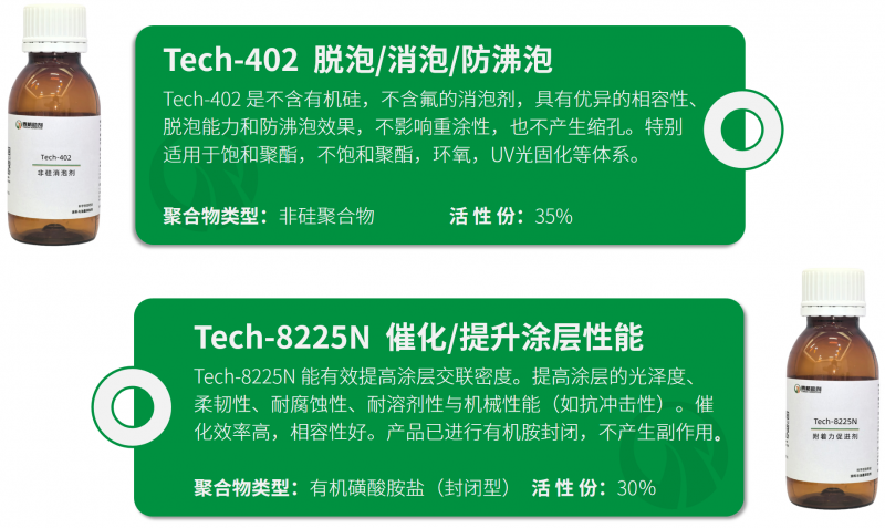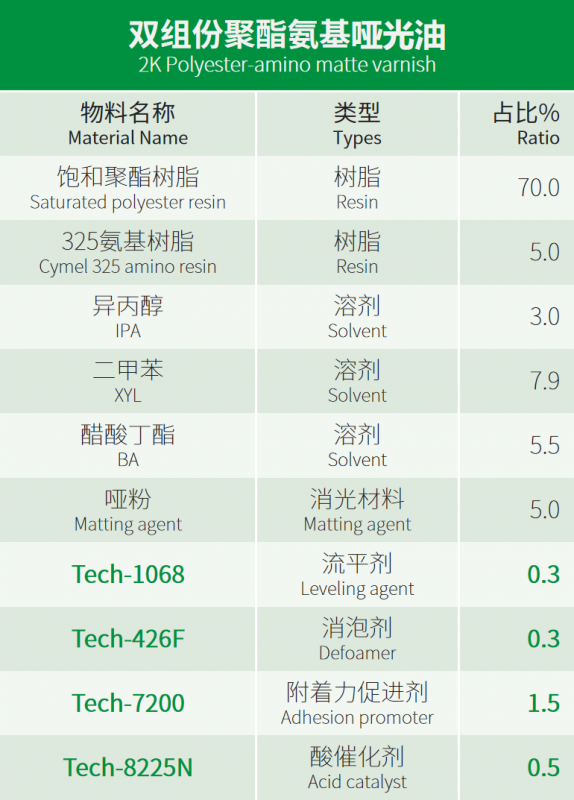 泰格助剂Tech-426F能更好的破坏哑粉导致的气泡液膜,减少稳泡的发生,配合高性能催化剂、附着力促进剂、流平剂,可大幅减少白点,提高哑粉排列性能,并提升涂层机械强度。该方案具有优异的热稳定性。