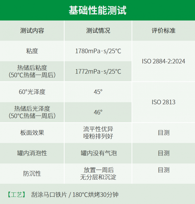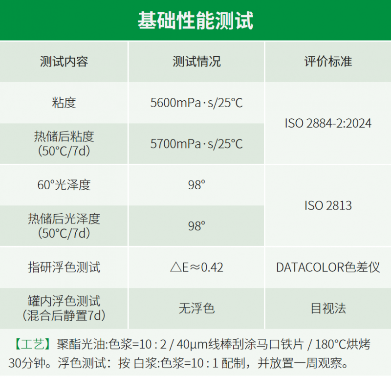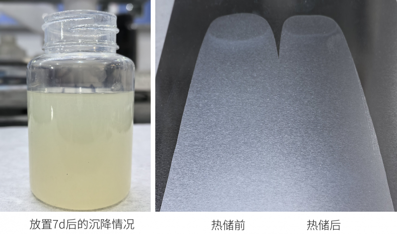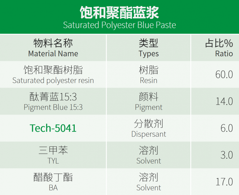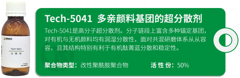 采用Tech-5041超分散剂对酞菁蓝进行稳定,对有效防止颜料絮凝。配方实测表明,热储前后,浆料无失光和明显后增稠情况发生,显示出优异的稳定性。