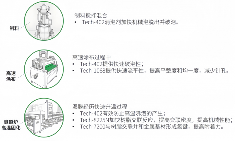 在整个涂料制备和辊涂工艺过程中掺杂着许多变量,而对配方性能冗余的考量,正是高级工程师/配方师的经验和技巧,得益于泰格助剂对行业应用的丰富经验,我们将协助您解决上述问题,提供助剂向的行业解决方案展示。