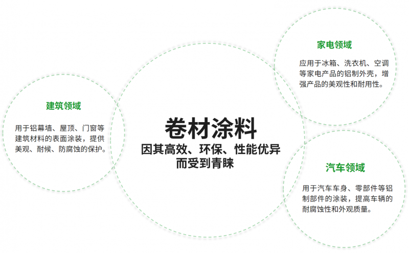 卷材涂料具有涂装速度快、涂层均匀且质量稳定的生产效率与质量优势,在长期经济效益上看,预涂工艺降低了整体成本,涂层耐久性好,使用寿命长,减少了维护费用,其应用领域主要为:建筑、家电、汽车领域。