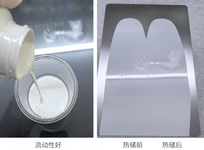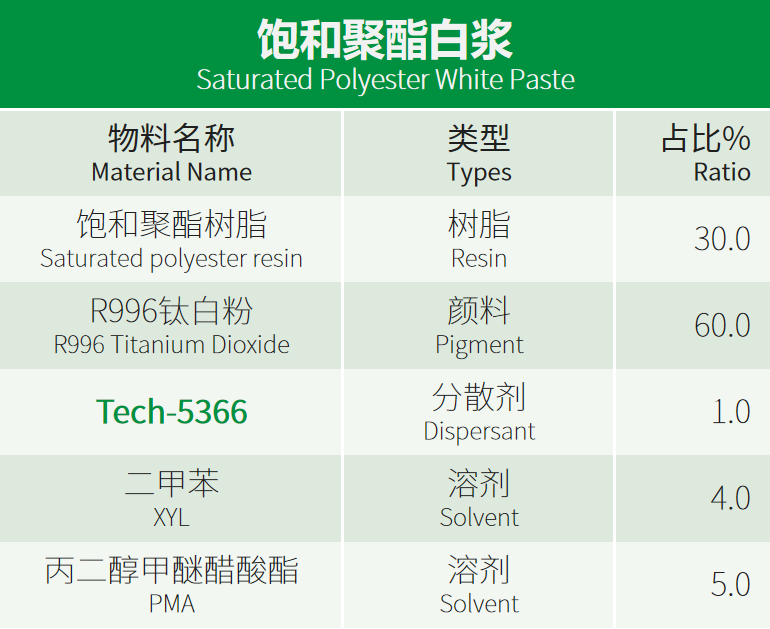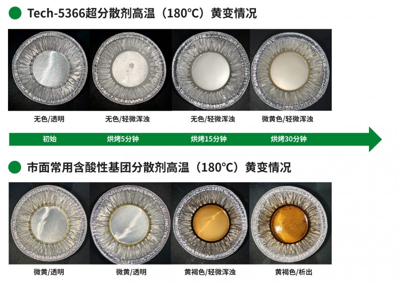 Tech-5366分散剂赋予聚酯白浆『高固低粘』的状态,其空间位阻让热储测试前后粘度、光泽度几乎无变化,热稳定性佳。泰格助剂尽可能避免了因苯环/萘环氧化、不饱和键断裂、含氮基团分解导致的分散剂本身黄变问题。