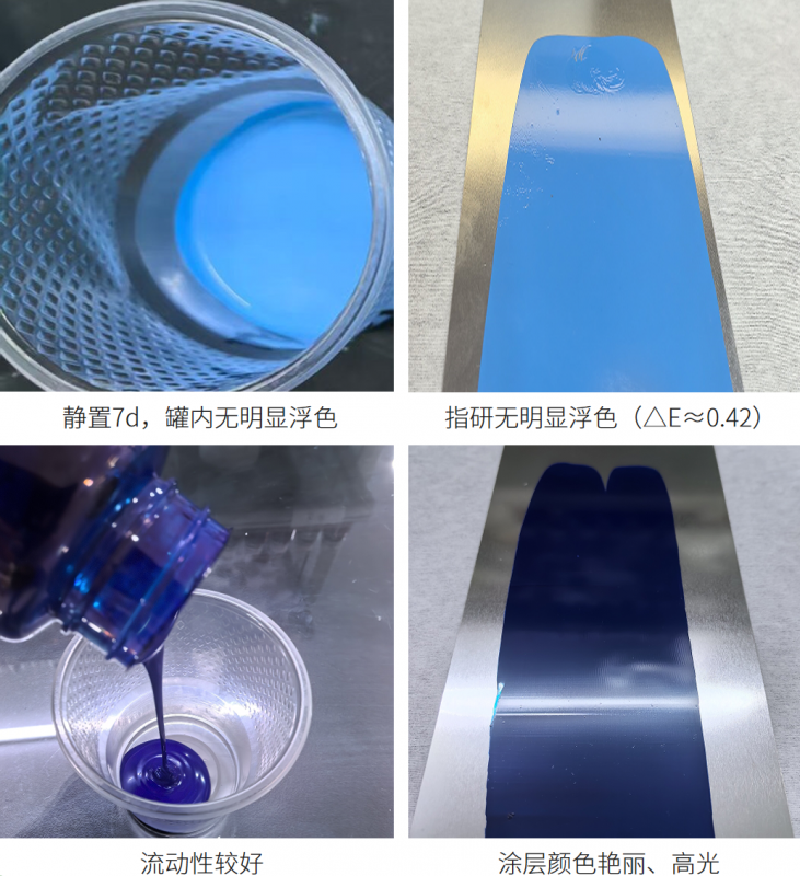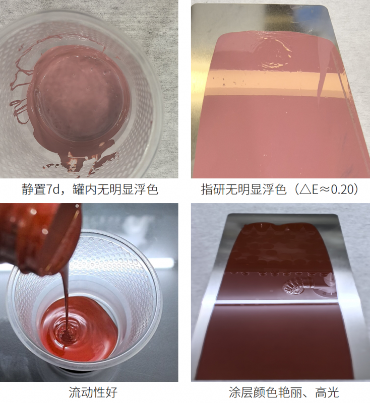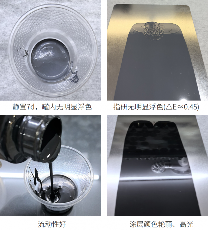 配方实测表明,Tech-6202对表现出优异的黑度、光泽度和热储存稳定性,且展现出很好的抗浮色性能,非常适合对于黑色色浆性能有较高要求的卷材涂料体系。