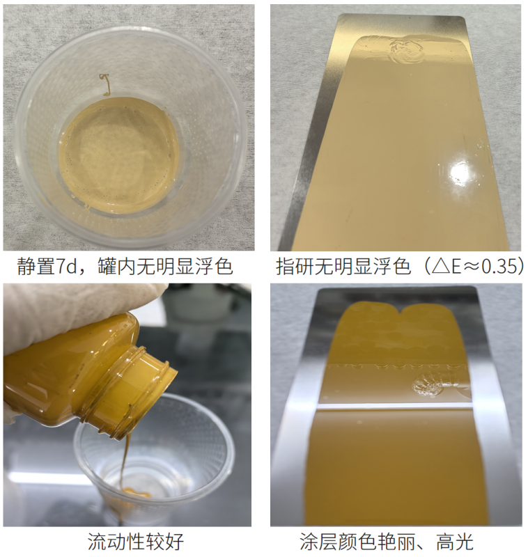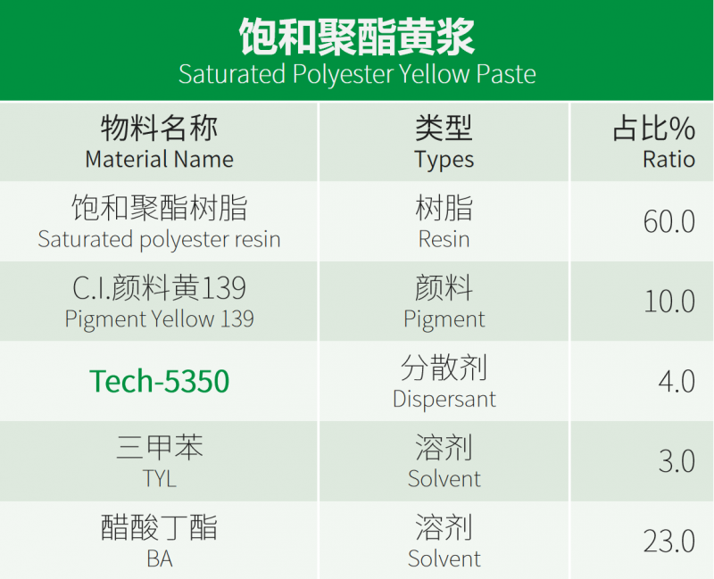 配方实测表明,采用Tech-5350超分散剂对PY139黄进行稳定,能对有效减少浆料失光和后增稠情况的发生,热储前后,均显示出优异的稳定性。