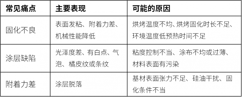 卷材光油常见一些典型问题,尤其在涂料上线后,高速涂布使得问题被凸显,主要包括以下三大痛点: