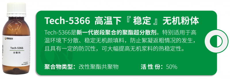 Tech-5366不含PFAS、苯类溶剂及有机锡,其改性聚酯长链能构建更厚的溶剂化层,通过包裹在颜料表面形成空间位阻抵御高温、剪切力及电解质干扰,实现稳定(粘度稳定、光泽度稳定,抗浮色稳定)。
