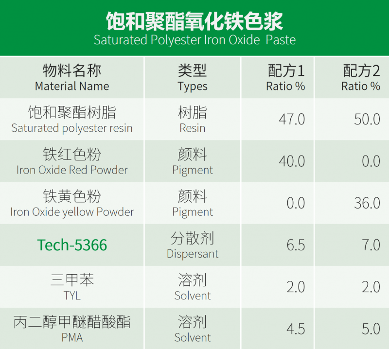 聚酯氧化铁烤漆结合了聚酯树脂的耐久性和氧化铁颜料的色彩稳定性,但在生产和施工中容易遇见浮色、储存/高温固化失光、后增稠等问题,对于此类粉体,我们依旧推荐使用Tech-5366作为解决方案,其高温下对无机物表面的包裹稳定性,表现地从从容容游刃有余。