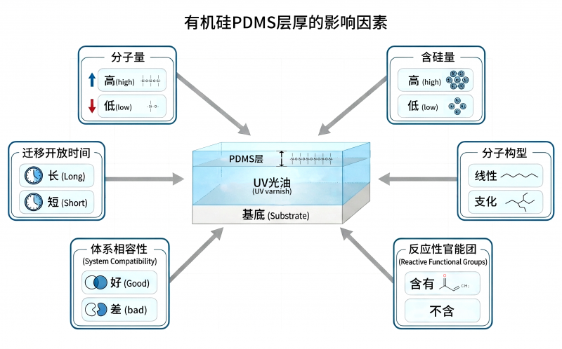有机硅PDMS层厚与其分子量、含硅量、分子构型、可反应基团、体系相容性、迁移开放时间与体系粘度等均有密切关系,需要实际测试验证。