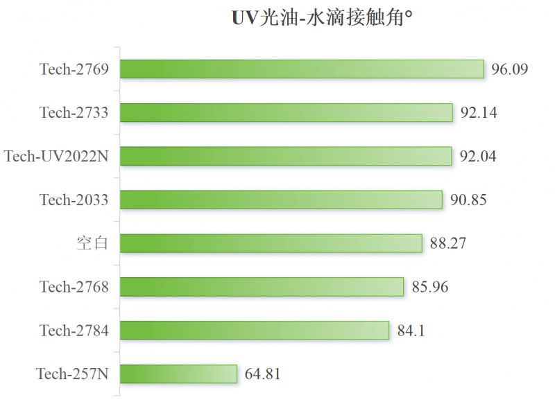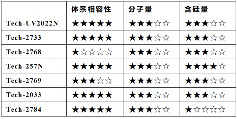UV光油相容性差是导致涂层浑浊、雾影、失透或黄变的主要原因,严重影响高光、透明产品的品质。测试中Tech-UV2022N、Tech-2733等相容性均表现较佳。但良好的相容性可能会导致有机硅迁移效率变低。