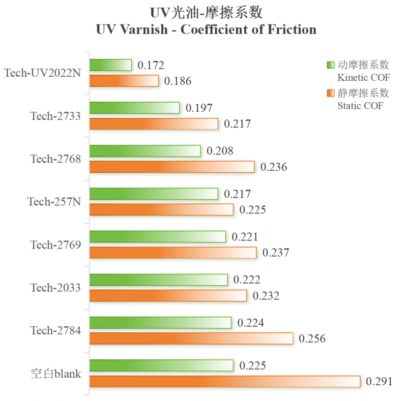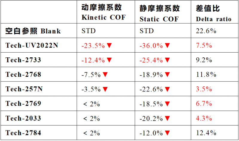实验数据表明,添加有机硅助剂的UV涂层表面摩擦系数均有下降。其中,Tech-2022N在滑动摩擦测试中表现优异,相比于空白对照组,其动摩擦系数和静摩擦系数分别大幅下降23.5%和36.0%,静动摩擦系数差比值仅7.5%,粘滑现象显著减弱,滑感优异。