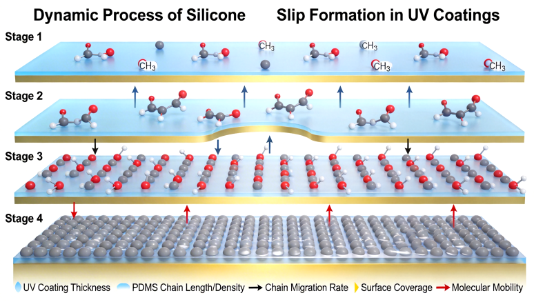 对于有机硅助剂而言,爽滑效果的形成是一个动态过程。在实际应用上,有机硅链段的舒展和迁移程度,很大程度上决定该助剂性能是否能被有效发挥。