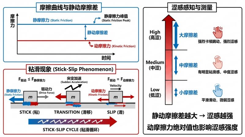 静摩擦力与动摩擦力之间的差异(即静动摩擦差)越大,意味着“粘滑”现象(Stick-Slip Phenomenon)趋势越强,而这种不稳定的、跳跃式的运动,是人体感知为“涩感”的核心物理来源。涩感的强度并非只由『静动摩擦差』单独决定,还与『动摩擦力本身的绝对值』密切相关。