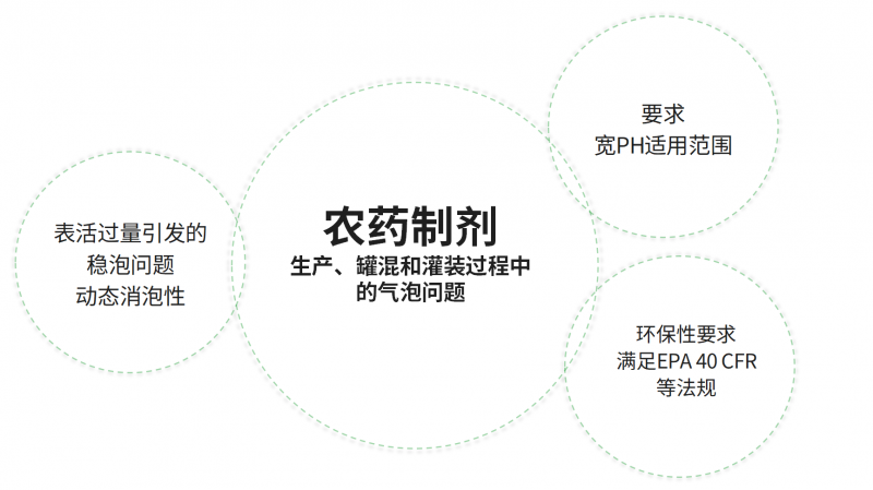 在农药生产、罐混和灌装过程中,高速剪切、搅拌、泵送等工序易产生大量泡沫,导致生产效率降低,影响制剂的质量稳定性,而人们依赖反复添加高剂量的消泡剂来解决问题,成本问题和低效问题显著。泰格高性能消泡剂设计初衷基于以下行业需求: