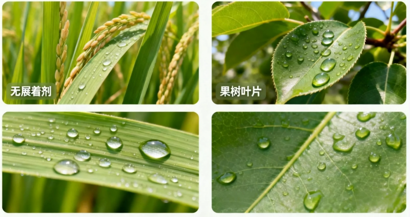 展着方面,农药在作物表面的润湿铺展能力则直接影响防治效果,面对不同作物叶面结构、蜡质层厚度、表面自由能存在显著差异,大部分润湿剂难以满足多样化需求。例如,水稻叶片表面具有明显的疏水性,而果树叶片往往具有较厚的蜡质层,需要特异性润湿方案。